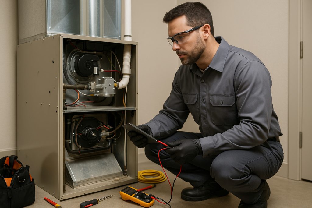 - Schedule an in‑home evaluation. A licensed technician should inspect the heat exchanger, burners, blower, electrical, gas/venting, airflow, and duct integrity.